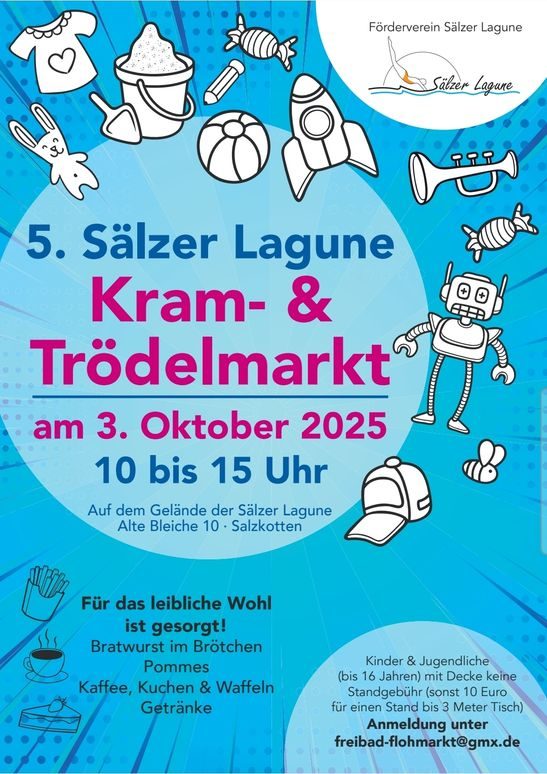 Der diesjährige Kram und Trödelmarkt findet wieder am 3. Oktober von 10.00 Uhr bis 15.00 Uhr im Innenbereich des Freibades statt.